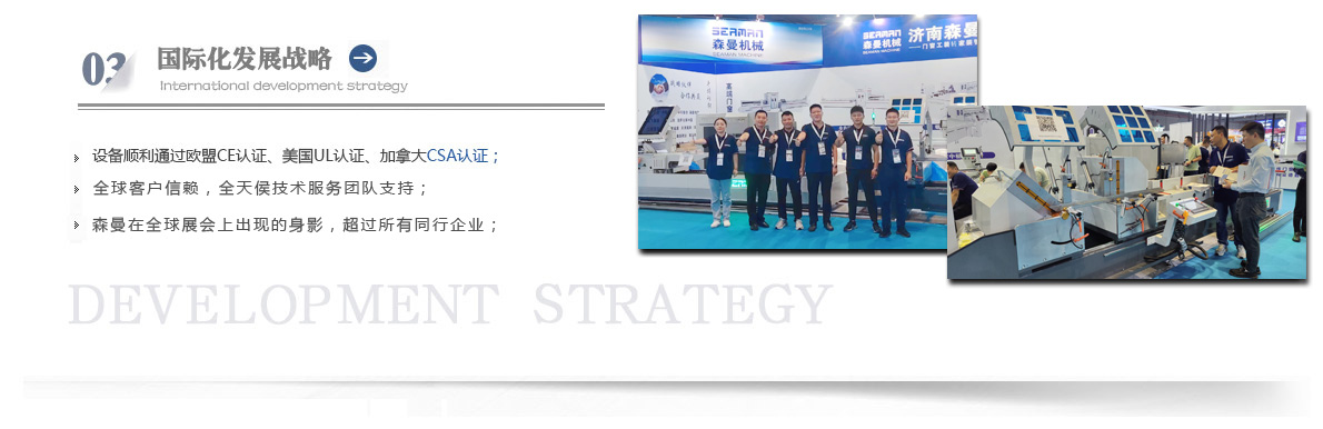 “森曼機械”作為全球門窗設(shè)備供應商,本著"seaman"精神,勇立潮頭,拼搏創(chuàng)新,以爭做行業(yè)為目標,在行業(yè)前輩發(fā)展的基礎(chǔ)上,努力學習,積極進取。目前公司產(chǎn)品涵蓋塑料門窗設(shè)備、鋁合金門窗設(shè)備、鋁幕墻設(shè)備、鋁木復合門窗設(shè)備及中空玻璃設(shè)備五大種類,近百個品種。公司產(chǎn)品銷售至全國各地及東南亞、非洲、東歐、北美等幾十個國家和地區(qū)。在這個競爭激烈的年代,我們正努力使我們的產(chǎn)品!